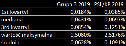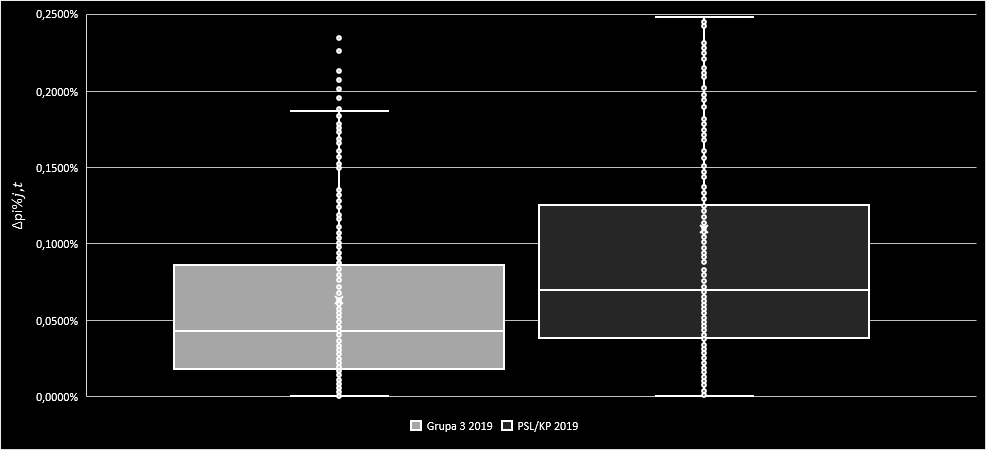 Porównanie rozkładu Δpi%j,t dla grupy 3 i PSL/PSL-KP 2019