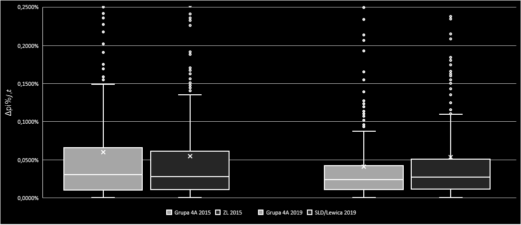 Porównanie rozkładu Δpi%j,t dla Grupy 4a oraz ZL/SLD-Lewica 2015-2019