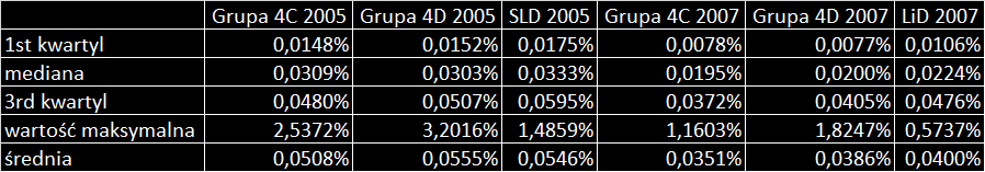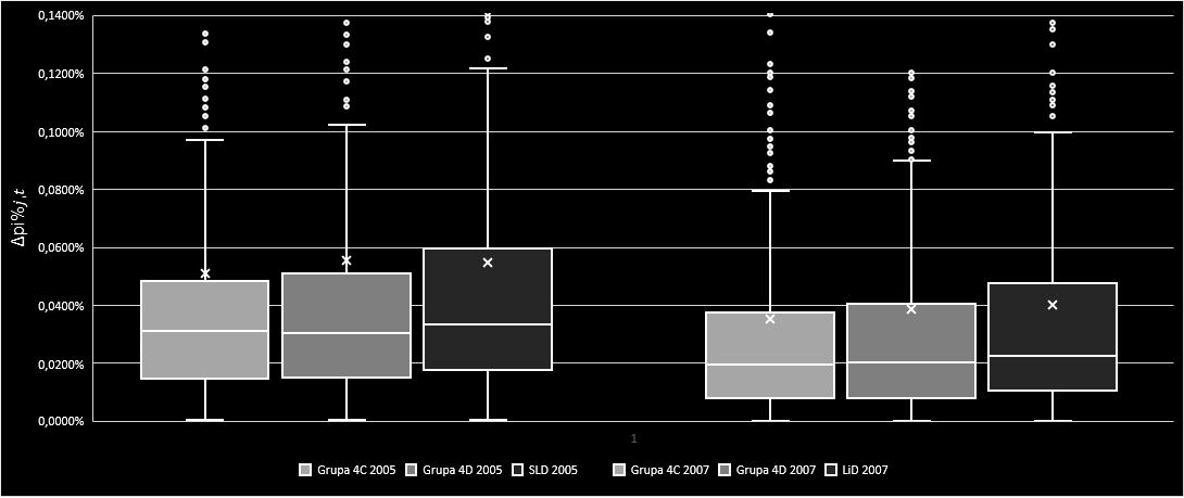 Porównanie rozkładu Δpi%j,t dla Grupy 4c i 4d oraz SLD/LiD 2005-2007