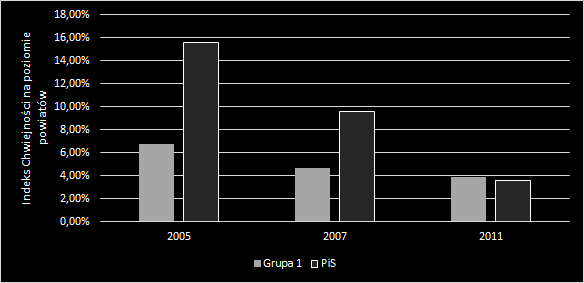 Dla grupy 1 (przejmowanie elektoratu LRP i SRP przez PiS):
