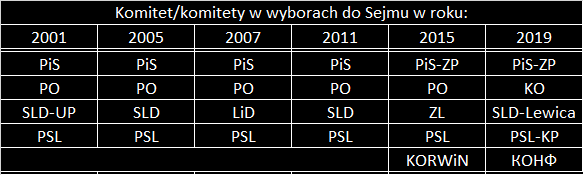 Wyniki głosowania w wyborach Sejmu RP na poziomie powiatów w latach 2001-2019 (dane PKW).