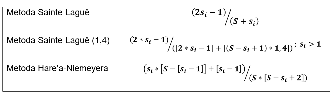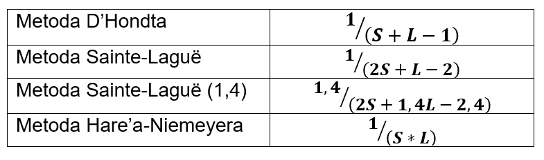 Dla metody D'Hondta jest ponownie banalny. Dla pozostałych metod (dla si=1) również prosty.