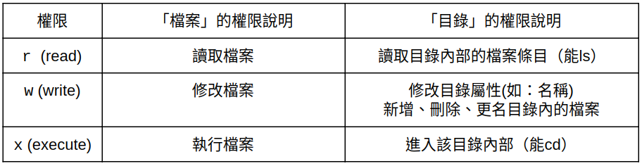 - 權力:讀(read) / 寫(write) / 執行(execute)
