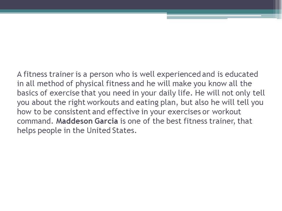 Maddeson Garcia offers best services related to the Health. In this presentation, you will get to know the Importance of a Fitness Trainer. https://medium.com/@maddesongarcia/maddeson-garcia-achieving-your-fitness-goal-with-fitness-trainer-e979eb314d84