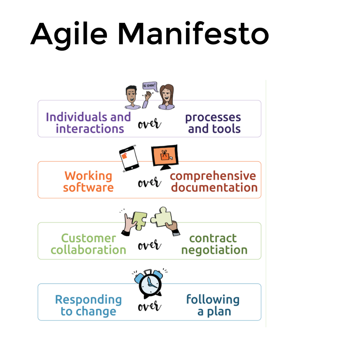 Agile is a time boxed, iterative approach to software delivery that builds software incrementally from the start of the project, instead of trying to deliver it all at once near the end.