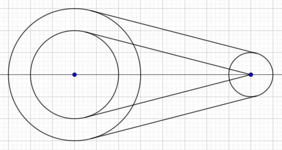 对点O做反演,原来的两个圆都会边长位似圆,现在要求的答案也就是外公切线了。