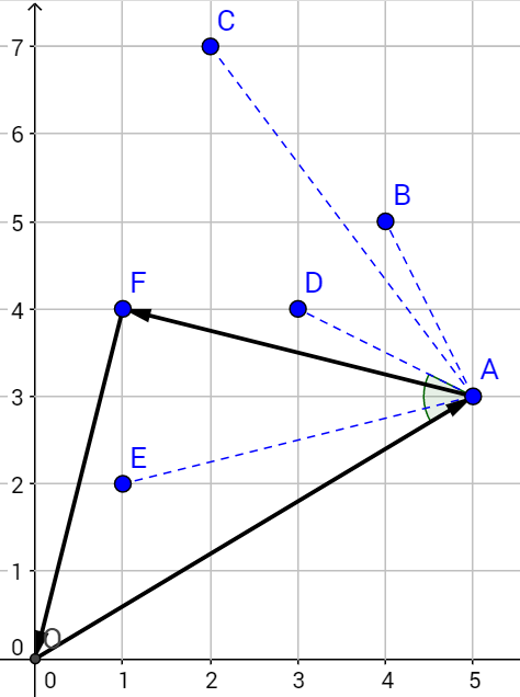 static db _; B = B-K, A = A-K, _ = atan2(B.y,B.x)-atan2(A.y,A.x),
