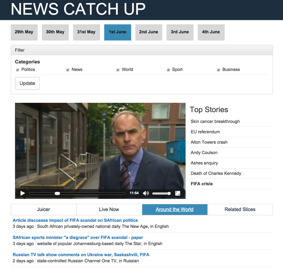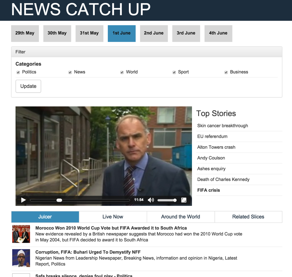News Catch Up displaying the 'FIFA' story, with related content from the Juicer