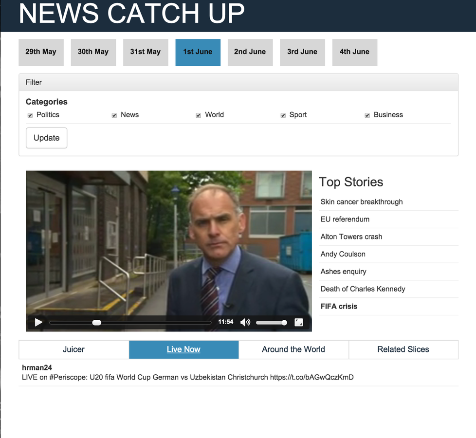 Catch Up News allows the audience to discover the main stories covered by BBC News while they have been away, and to find related content from other providers, as well as current live video events from Periscope and Meerkat.