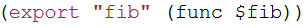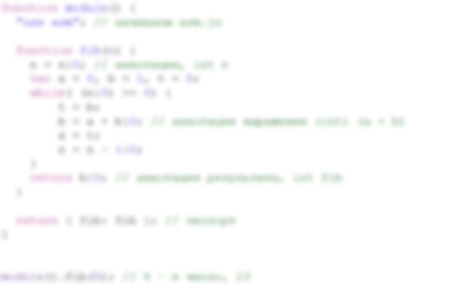 module().fib(5); // 8 - е число, 13Пример: fib.wast