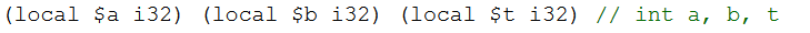 (local $a i32) (local $b i32) (local $t i32) // int a, b, t
