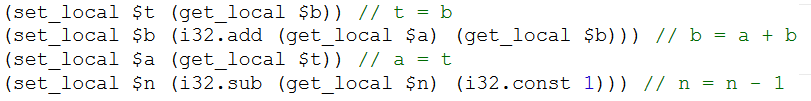 (set_local $b (i32.add (get_local $a) (get_local $b))) // b = a + b