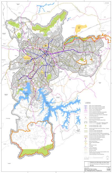 Localização da rede de tranportes na cidade de São Paulo. A região central é a que possui a maior concentração da rede de transportes.