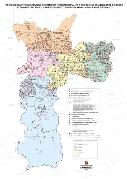 Localização dos equipamentos de saúde na cidade de São Paulo. A região central é a que possui a maior concentração maior concentração de hospitais.