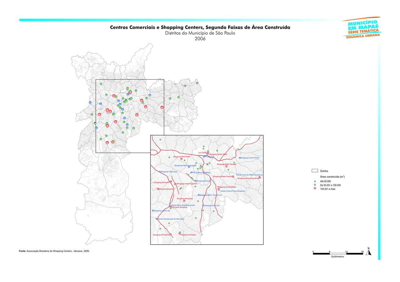 Localização dos centros comerciais e shopping centers na cidade de São Paulo. A região central é a que possui a maior concentração destes estabelecimentos. Fonte: Associação Brasileira de Shopping Centers - Abrasce, 2006.