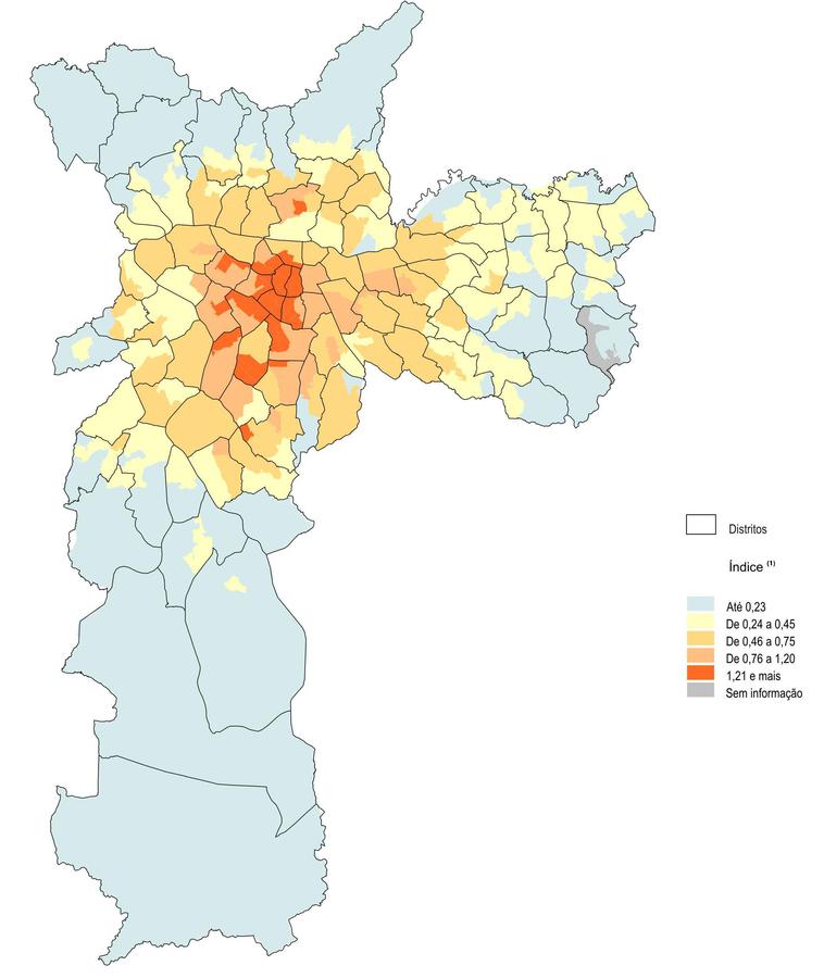 Densidade de área construída do município de São Paulo - 2004. Fonte: Secretaria Municipal de Finanças/Departamento de Rendas Imobiliárias.