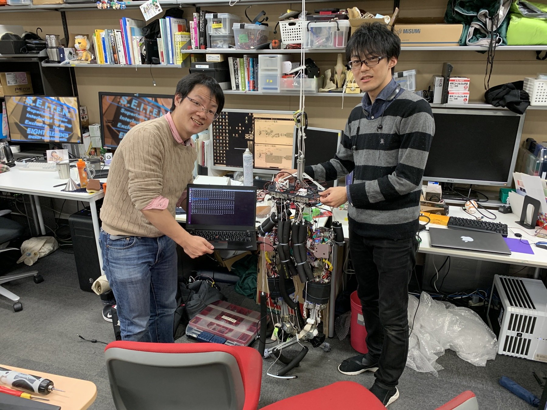 One of my momumental moment when our musculoskeletal legs successfully operated for the first time. He has about 50 motors and motor drivers.