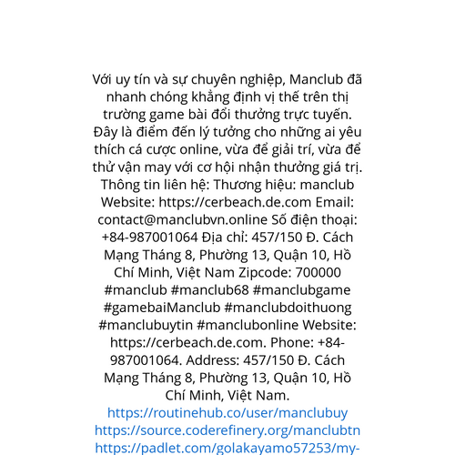 Website: https://cerbeach.de.com. Với uy tín và sự chuyên nghiệp, Manclub đã nhanh chóng khẳng định vị thế trên thị trường game bài đổi thưởng trực tuyến. Đây là điểm đến lý tưởng cho những ai yêu thích cá cược online, vừa để giải trí, vừa để thử vận