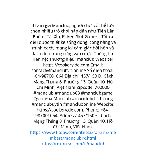Website: https://cookery.de.com. Tham gia Manclub, người chơi có thể lựa chọn nhiều trò chơi hấp dẫn như Tiến Lên, Phỏm, Tài Xỉu, Poker, Slot Game… Tất cả đều được thiết kế sống động, công bằng và minh bạch, mang lại cảm giác hồi hộp và kịch tính tro