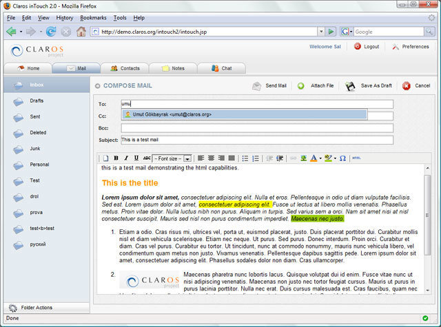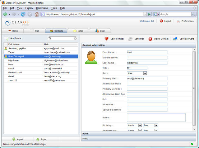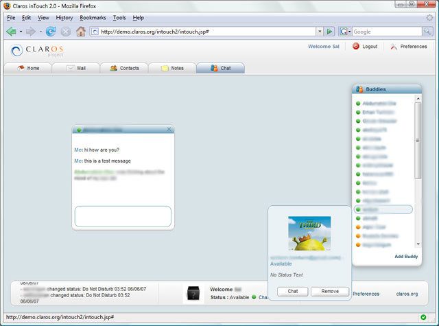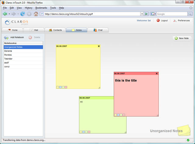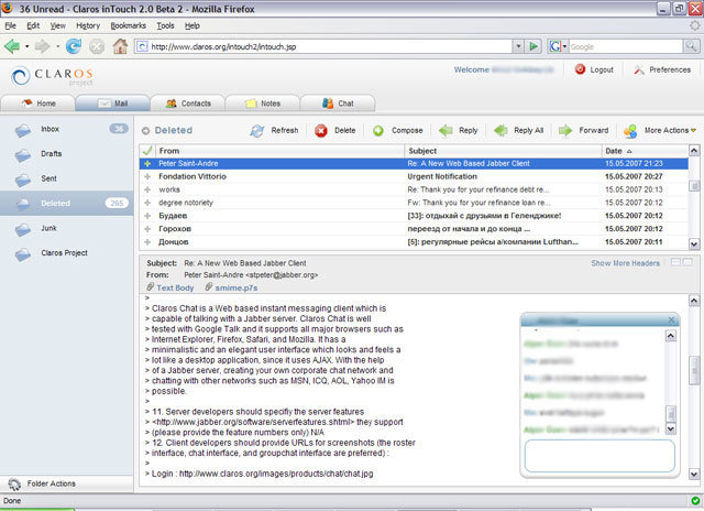 - Claros inTouch is an Ajax communication suite with key features such as webmail, address book, post-it notes, calendar (in progress), webdisk (in progress), built-in instant messenger(chat) and rss reader.
