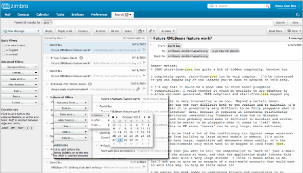 - Zimbra includes complete email, address book, calendar, file-sharing and tasks