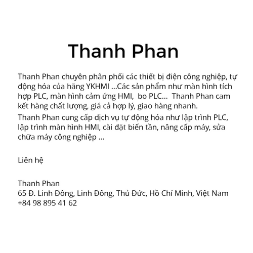 Chuyên phân phối các thiết bị tự động hóa hãng YKHMI. Cung cấp dịch vụ tự động hóa, lập trình plc Liên hệ Thanh Phan 65 Đ. Linh Đông, Linh Đông, Thủ Đức, Hồ Chí Minh, Việt Nam +84 98 895 41 62 https://thanhphan.vn