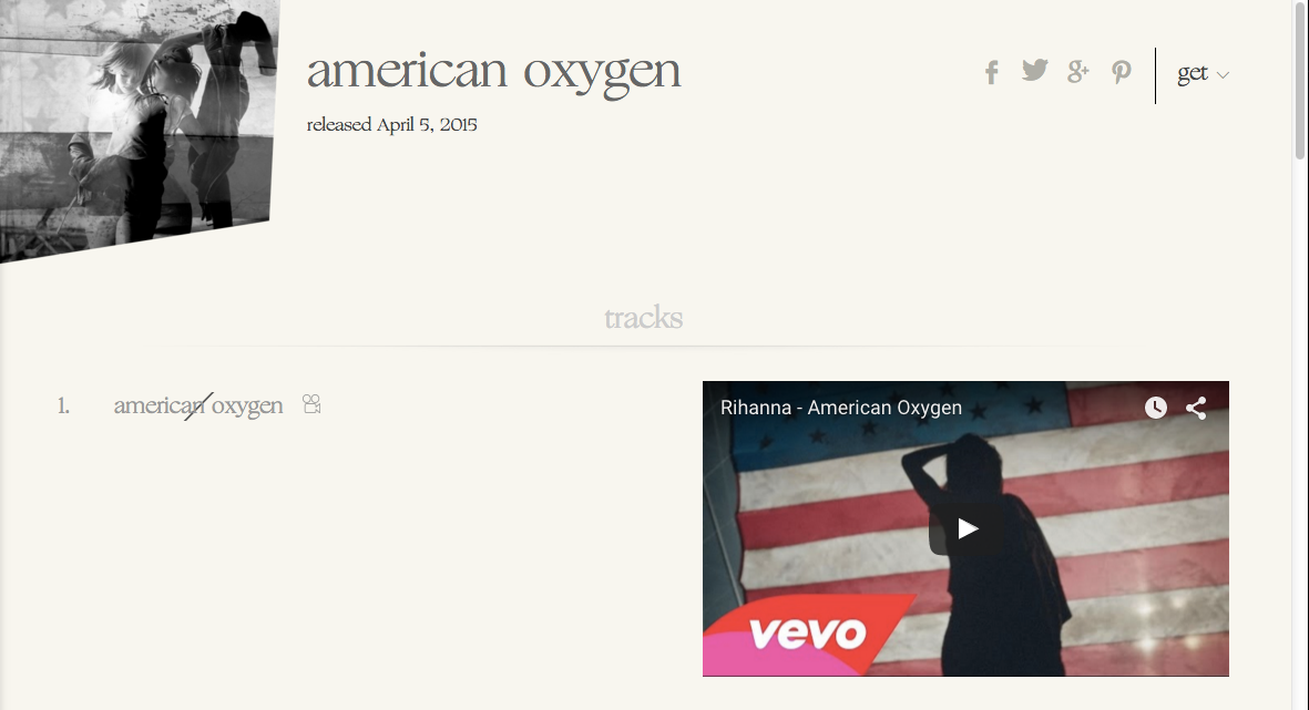 We see a "cover" page for the website with a banner-type image advertising her new album "ANTI R8". This cover page has really influenced me to create my own cover page for my website as it looks very professional and sleek.