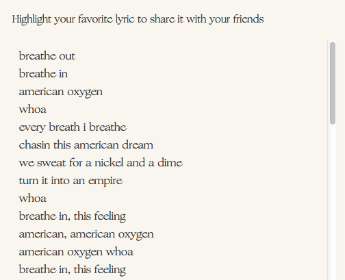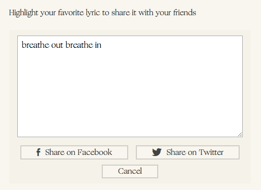 We are given the option to "Highlight your favourite lyric to share with your friends". The website encourages the use of social media in a very subtle way that isn't in your face unlike other websites, something I really admire about the website.