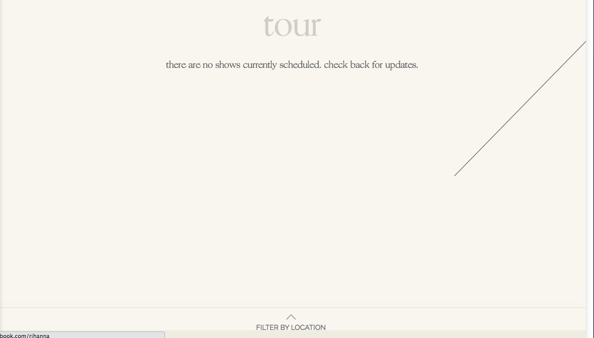 Her "Tour" page is currently empty as it states to "check back for updates". The page keeps to the same colour and backgrounds used throughout the rest of the website which shows consistency.