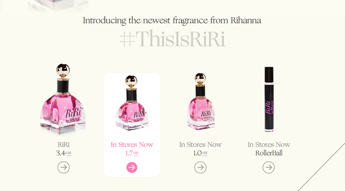 Her "Fragrance" page is dedicated to promoting her newly released perfume named "RiRi" with links towards the bottom of the page to buy the fragances.