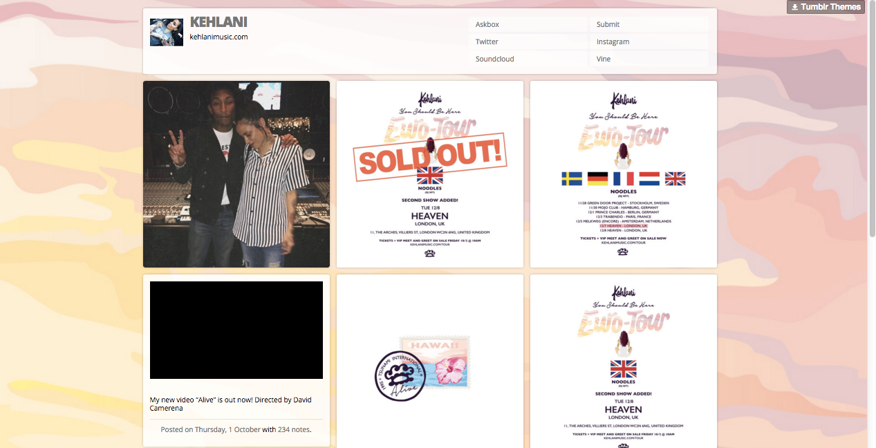 The entire website uses a 1 column design making viewing it easier and quicker as the content is in one column. The homepage an almost endless supply of content as we get to se what Kehlani has been doing (informing the fans). The blog link redirects you to her Tumblr blog which gives you a more indepth look at what she has been doing.