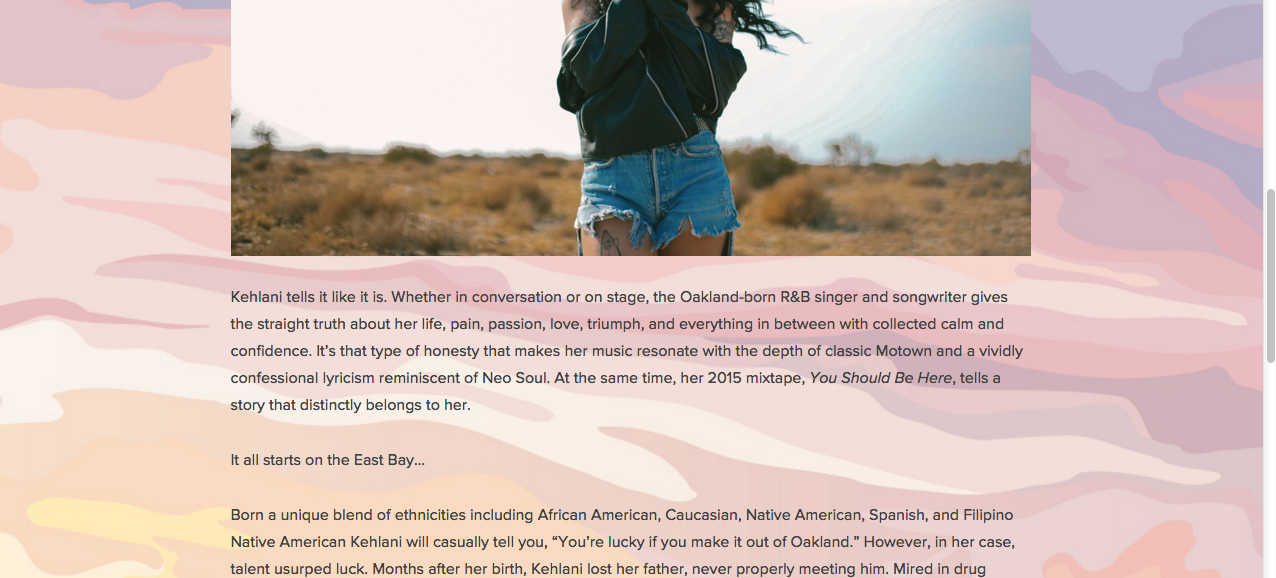 Her "About" page gives the reader a look into Kehlani's career from start to current time. I would like to imitate the design of her About page as the layout is appealing to me.