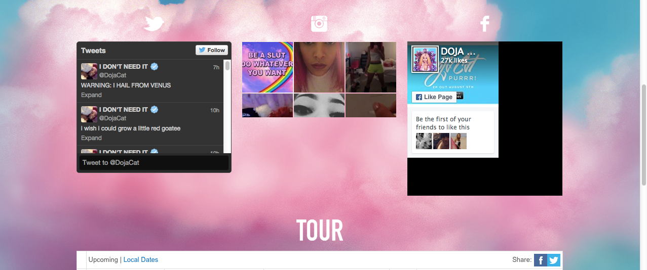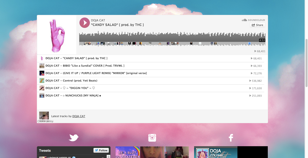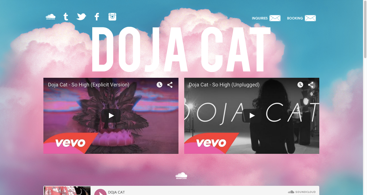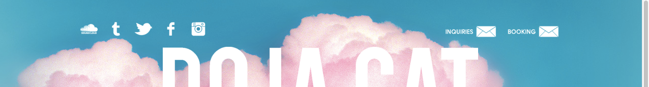 The imagery and colours used in this website are very well thought out as the only image we see is the background image which is of pink clouds in a blue sky. Being "up in the clouds" heavily correlates with Doja Cat's new single "So High" as both are phrases used to describe being on drugs. Delving deeper into the imagery, the pink clouds have relations with being"out of touch with reality" which is anothr way of describing being on drugs (relating to her current single). Adding to that, the vibrant blue skies could be related to drugs also as it is commonly known as the street name of crystal meth (breaking bad reference) again relating to her single "So High".