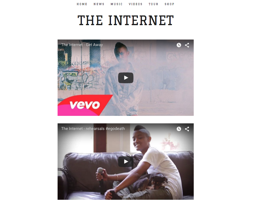 The structure of the website changes for the remaining 4 pages (News, Music, Videos and Tour) as they all use a one column design, the background is now white, the navigation bar is at the very top, the logo is beneath the navigation bar and the social buttons/links are in the footer of the page.