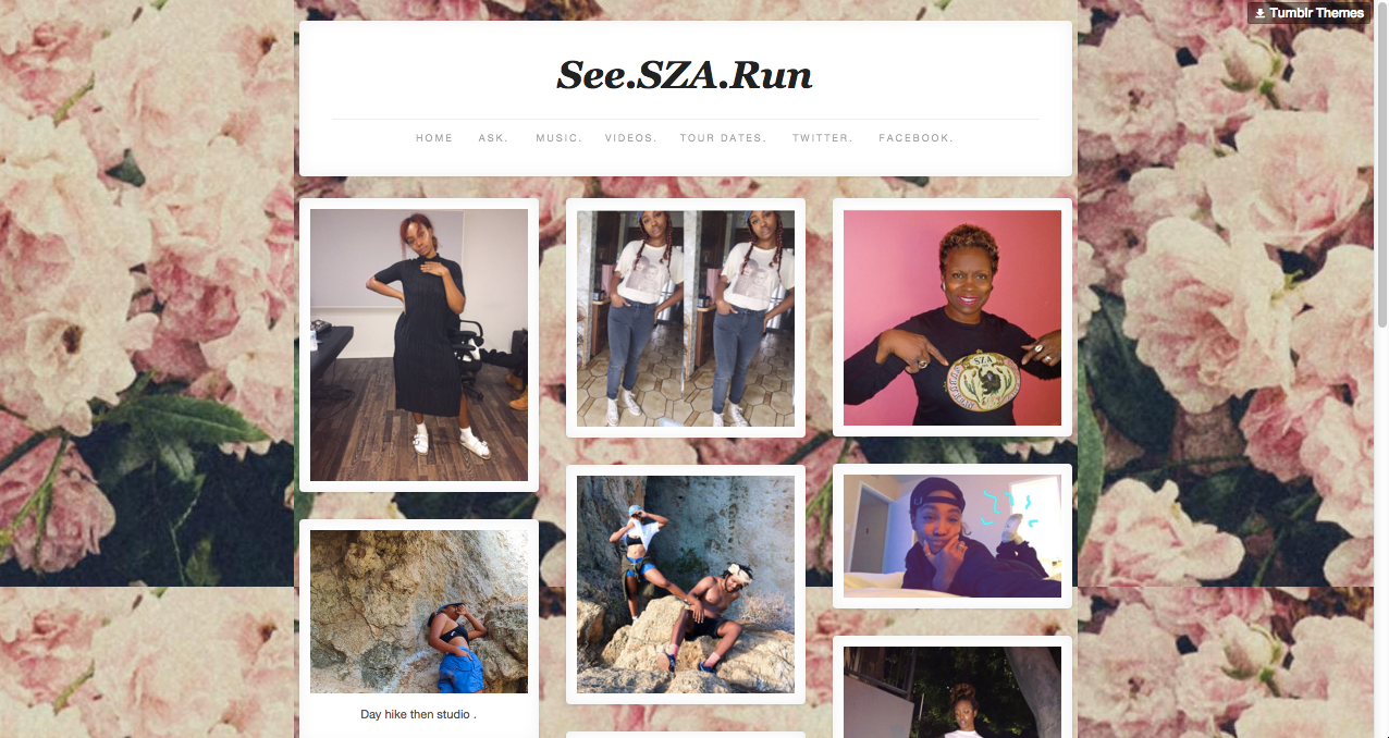 SZA's website is a customised Tumblr blog. Her website/blog has a very personal feel to it as all the content we see on the homepage are things that SZA has "liked" or "reblogged". Her logo "See.SZA.Run" is also a link back to the home page which is an element I would like to incorporate into my website when I create it.