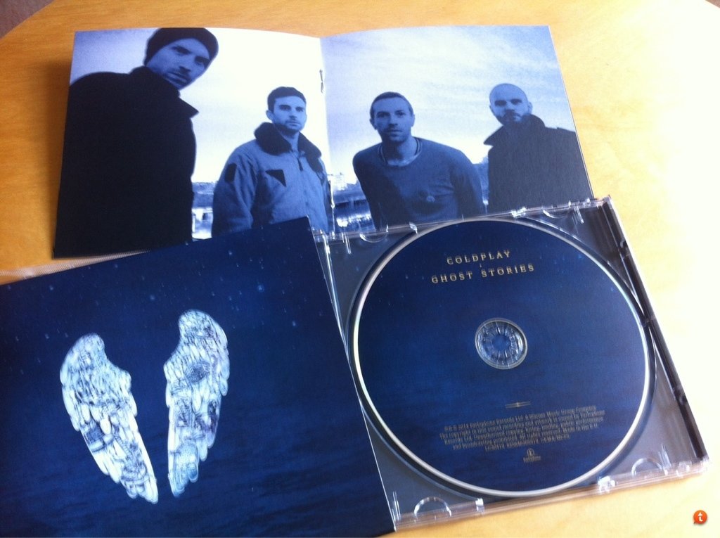 As I have previously mentioned, because the band are well known they won't need a specific logo or branding on their digipak because people are already familiar with who they are, when creating my digipak I will have a logo that will appear on both the digipak, the music video and the website to show consistency as my band aren't very well known. At the top of the CD we see the name of the band "Coldplay" and the album title "Ghost Stories". At the bottom of the CD we see all the copyright information. The texts are all gold which makes them stand out however it is a dirty gold colour which makes it look calming.