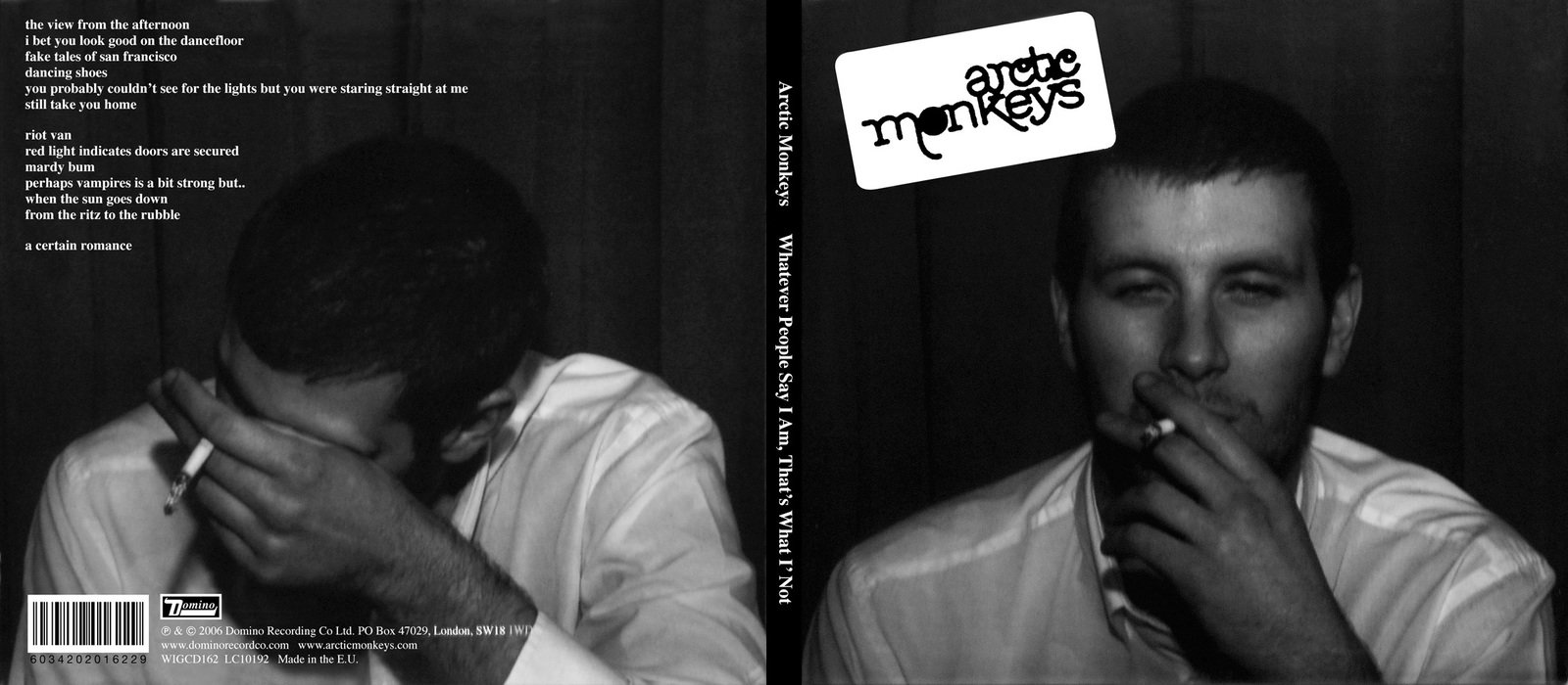 Similarly to the Loud digipak I analysed before, Arctic Monkey's digipak uses the conventional 4 panel book-styled design. The entire digipak is in black and white which may show that they are trying to be purposefully plain and to fit in. It feels almost as if they have tried to make the digipak as plain as possible, but in retrospect Arctic Monkey's style has always gone against pop culture as they have always tried to differentiate themselves from pop society as much as possible.