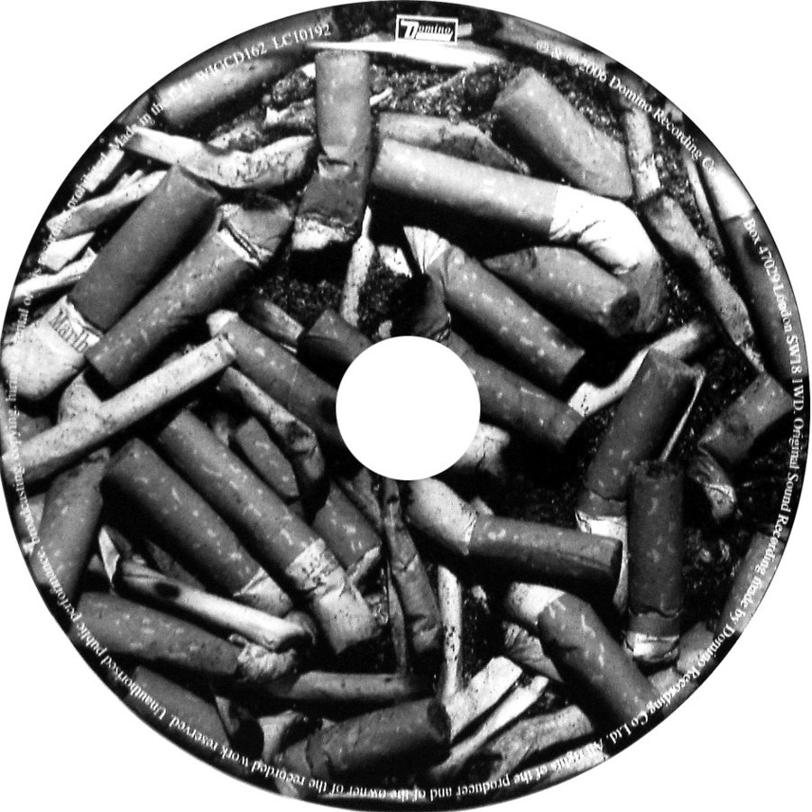 The CD has no virtually no text on it and the main image we see is piles of cigarette butts on top of each other. This adds to the image of the man on the front cover smoking which could signify his addiction to nicotine or even further connote that Arctic Monkey's music is addictive. Keeping to the theme, the image on the CD is also in black and white.