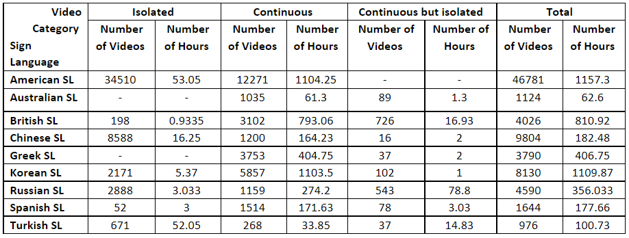 - Almost 1100 hours of video downloaded for American Sign Language.
