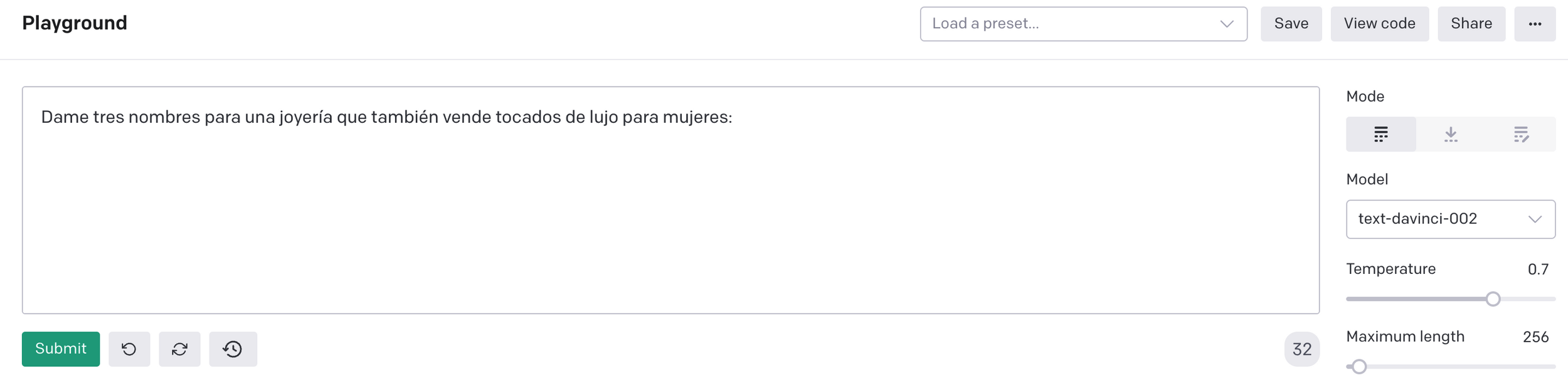 - model: el modelo que se quiere usar. Davinci 2 es el más potente, pero también el más caro. lo recomendable es empezar con él y tras ver de lo que es capaz, ir probando con los otros modelos más especializados si logramos más o menos un buen desempeño para nuestra aplicación. Los otros modelos para NLG son Curie, Babbage y Ada. Sus características se pueden consultar aquí.