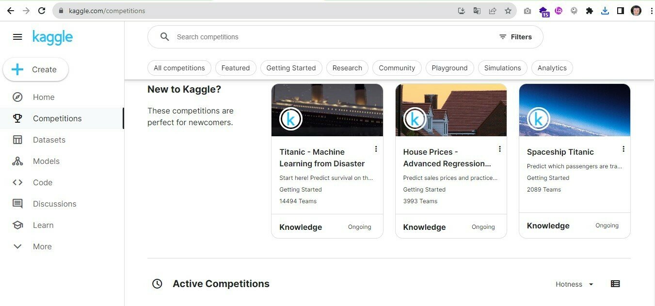 Una plataforma que ha crecido mucho en los últimos años y que se ha convertido en referencia para todos los que desarrollan modelos de machine learning, es Kaggle. En esta plataforma se publican retos por parte de empresas y organizaciones en los que es necesario utilizar los datasets que éstas comparten y crear un modelo que, tras ser entrenado con dichos datos, sea útil para la misión de la organización que recurre a la comunidad. La plataforma cuenta con un catálogo de datasets muy variado y amplio, por lo que es un medio ideal para todos los que están aprendiendo o que necesitan probar nuevas técnicas con datos reales y actuales en algún caso de uso concreto.