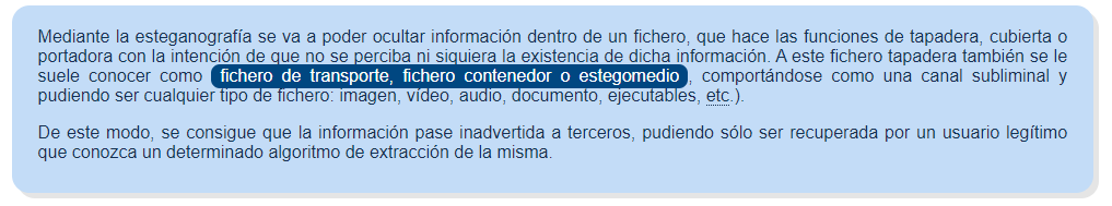 Inserta un mensaje oculto dentro de otra información (tapadera) => no se perciba la existencia de ese mensaje