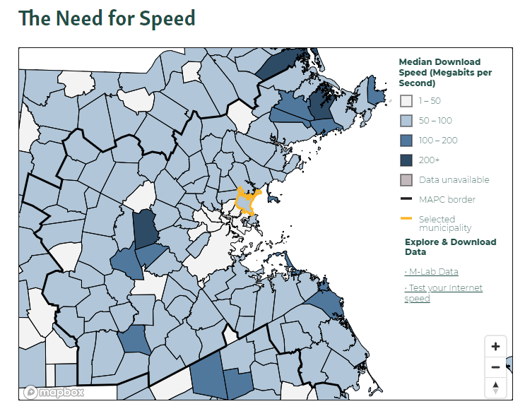 Open Data Sources Indicate that Chelsea and Revere have slower median speeds than many communities in the region.