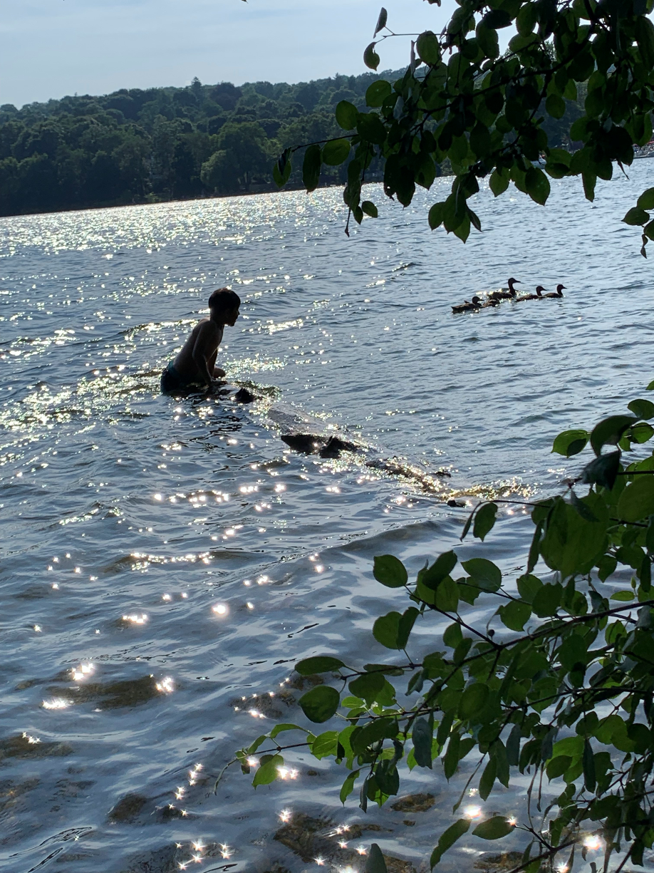 Esta foto fue tomada en Mystic River en la ciudad de Medford. Era un día muy caluroso con 100° F. Me gustó ver a la familia de patos disfrutando del agua fresca y ese hermoso lugar rodeado de muchos árboles. ¡¡Él es mi hijo disfrutando de ese hermoso día!!