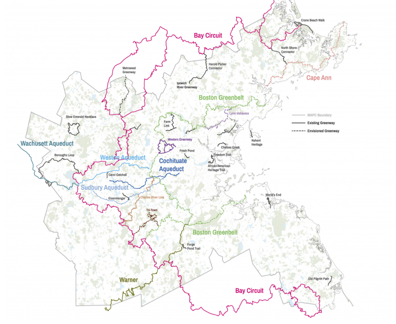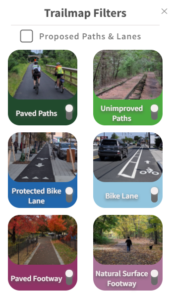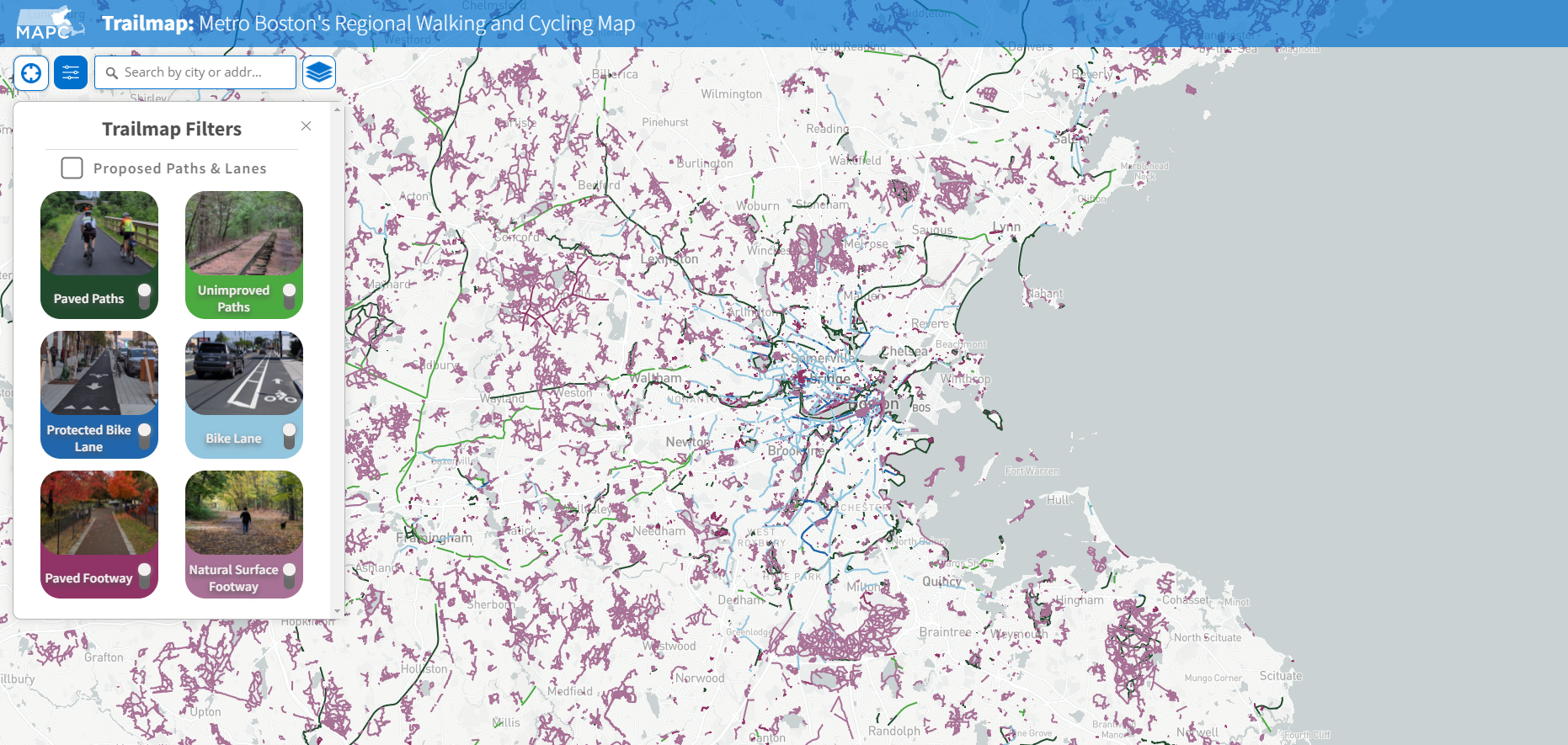 Trailmap is MAPC's dataset of current and proposed footpaths, shared-use paths, and on-road bicycle facilities; and the website where that dataset is published for public use. Development of has been funded through UPWP and foundation funding.