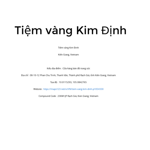 Tiệm vàng Kim Định Kiến Giang, Vietnam Kiểu địa điểm : Cửa hàng bán đồ trang sức Địa chỉ : 08-10-12 Phan Chu Trinh, Thanh Vân, Thành phố Rạch Giá, tỉnh Kiên Giang, Vietnam Tọa độ : 10.0115293, 105.0842765 Website : https://maps123.net/vi/VN/tiem-vang-kim-dinh-p1054330 Compound Code : 236M+JP Rạch Giá, Kien Giang, Vietnam