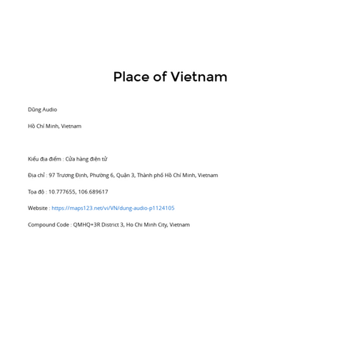 Dũng Audio Hồ Chí Minh, Vietnam Kiểu địa điểm : Cửa hàng điện tử Địa chỉ : 97 Trương Định, Phường 6, Quận 3, Thành phố Hồ Chí Minh, Vietnam Tọa độ : 10.777655, 106.689617 Website : https://maps123.net/vi/VN/dung-audio-p1124105 Compound Code : QMHQ+3R District 3, Ho Chi Minh City, Vietnam