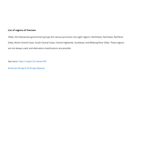 Often, the Vietnamese government groups the various provinces into eight regions: Northwest, Northeast, Red River Delta, North Central Coast, South Central Coast, Central Highlands, Southeast, and Mekong River Delta. These regions are not always used, and alternative classifications are possible.
