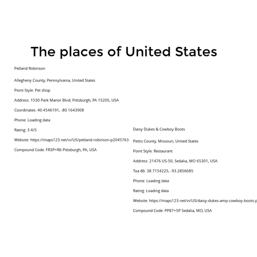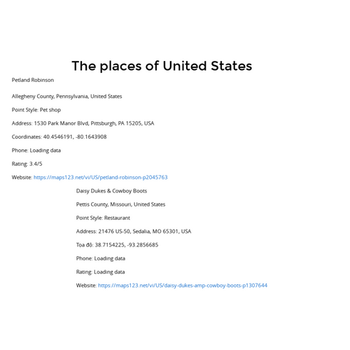 The places of United States Petland Robinson Allegheny County, Pennsylvania, United States Point Style: Pet shop Address: 1530 Park Manor Blvd, Pittsburgh, PA 15205, USA Coordinates: 40.4546191, -80.1643908 Phone: Loading data Rating: 3.4/5 Website: https://maps123.net/vi/US/petland-robinson-p2045763 Compound Code: FR3P+R6 Pittsburgh, PA, USA ----------------------------------- Daisy Dukes & Cowboy Boots Pettis County, Missouri, United States Point Style: Restaurant Address: 21476 US-50, Sedalia, MO 65301, USA Tọa độ: 38.7154225, -93.2856685 Phone: Loading data Rating: Loading data Website: https://maps123.net/vi/US/daisy-dukes-amp-cowboy-boots-p1307644 Compound Code: PP87+5P Sedalia, MO, USA