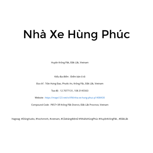 Huyện Krông Păk, Đắk Lắk, Vietnam Kiểu địa điểm : Điểm bán ô tô Địa chỉ : Trần Hưng Đạo, Phước An, Krông Pắc, Đắk Lắk, Vietnam Tọa độ : 12.7077131, 108.3145563 Website : https://maps123.net/vi/VN/nha-xe-hung-phuc-p1408430 Compound Code : P857+3R Krông Pắk District, Đắk Lắk Province, Vietnam